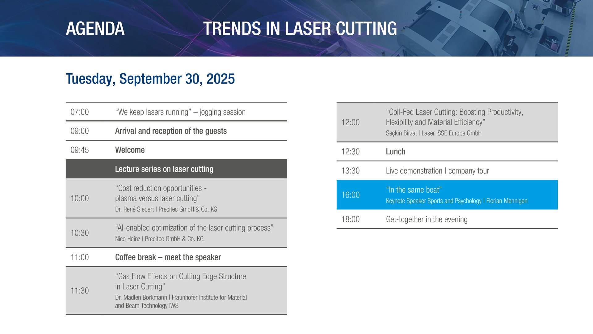 In the morning, you can look forward to exciting specialist presentations that will introduce you to the latest developments and applications. On each day of the event, you can take part in one of two parallel sessions - either on laser welding and quality monitoring or on laser cutting and additive manufacturing.